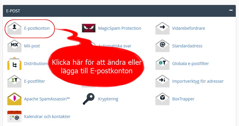 Här föjer en beskrivning hur du lägger till epostadresser i din cPanel.